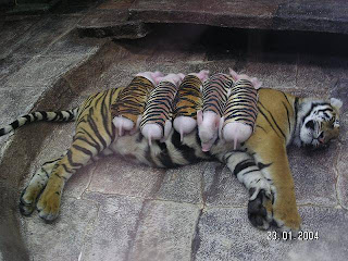 Em um zoológico Californiano, uma tigresa teve três filhotes, um fato raro entre os tigres de zoológico. Complicações durante a gravidez, levaram ao nascimento prematuro de suas crias, e sem tamanho e peso adequados, morreram logo após o parto.